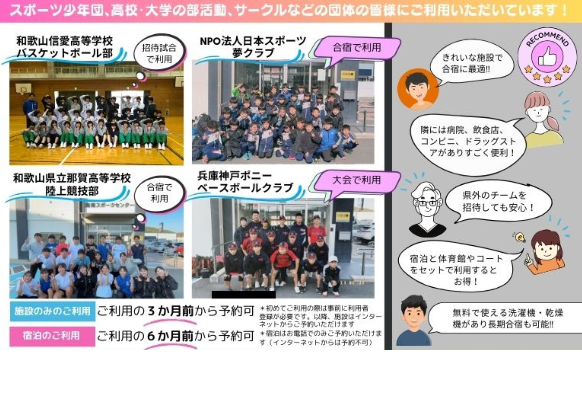 *フットサルコート・体育館・体育室は別途使用料が必要です。但し、海南市外のスポーツ団体で、高校生以下の団体が宿泊とセットで利用する場合は7割引きとなります。